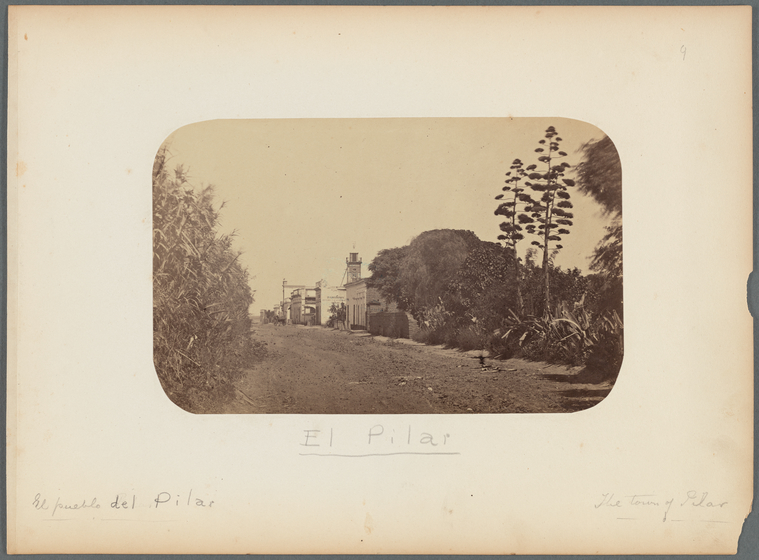 La imagen es titulada “El pueblo de Pilar”, junto a su traducción en inglés “The town of Pilar”. Curiosamente, el autor no realizó la típica toma del frente de la parroquia o retratando la plaza, sino que se muestra a una calle del por entonces incipiente pueblo.